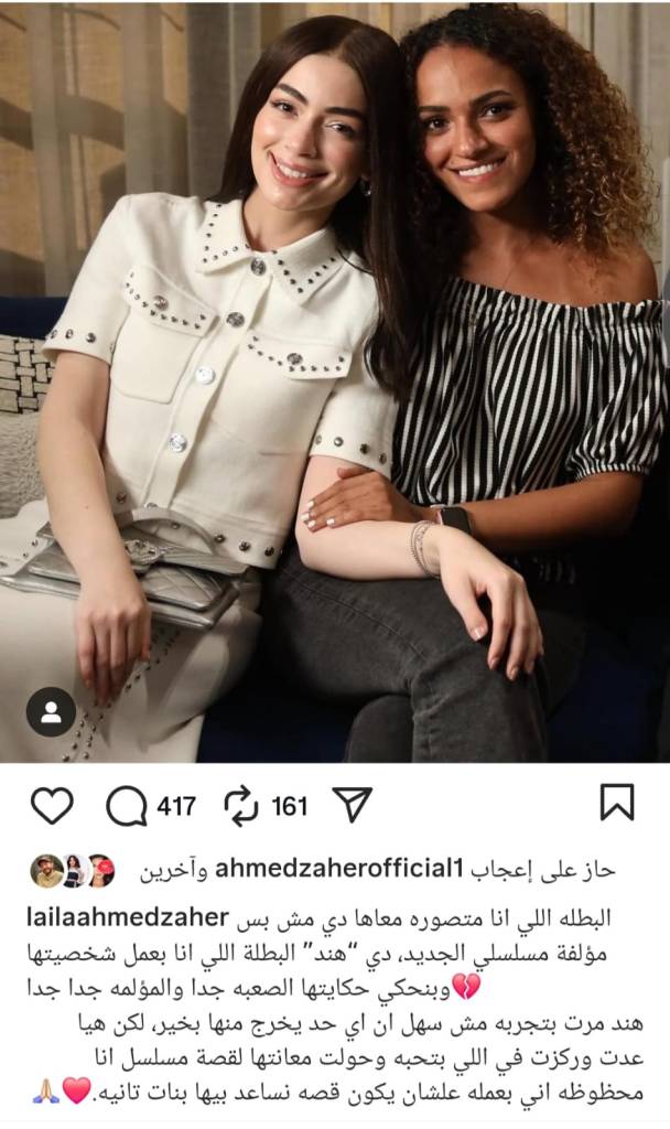 كشفت الفنانة ليلي أحمد زاهر تفاصيل شخصيتها في حكاية “هند” التي تعرض ضمن حكايات مسلسل “ما تراه ليس كما يبدو” علي قناة Dmc ومنصة Watch it الرقمية، بدءا من يوم السبت المقبل 30 اغسطس الجاري.وشاركت ليلي أحمد زاهر صورة مع هند عبدالله مؤلفة العمل وبطلة حكاية هند الحقيقية علي حسابها علي “انستجرام” وقالت: “البطلة اللي أنا متصورة معاها دي مش بس مؤلفة مسلسلي الجديد، دي هند البطلة اللي أنا بعمل شخصيتها وبنحكي حكايتها الصعبة جدا والمؤلمة جدا جدا”.وأضافت: «هند مرت بتجربة مش سهل أن أي حد يخرج منها بخير، لكن هي عدت وركزت في اللي بتحبه وحولت معانتها لقصة مسلسل أنا محظوظة إني بعمله علشان يكون قصة نساعد بيها بنات تانية».واختتمت: «أنا أسفة إنك مريتي بالوجع ده، وفخورة بيكي أوي إنك عديتيه.. ويا رب حياتك كلها تبقى فرح وسعادة ونجاحات زي ما تستحقي، متحمسة قوي تشوفوا قصة هند ويا رب تعجبكم».يذكر أن حكاية “هند” من بطولة ليلى أحمد زاهر، حازم إيهاب، هاجر الشرنوبي، مؤمن نور، ياسمين رحمي، والفنانة القديرة حنان سليمان، والعمل من تأليف هند عبدالله وإخراج خالد سعيد، ويعرض علي قناة dmc ومنصة watch it.