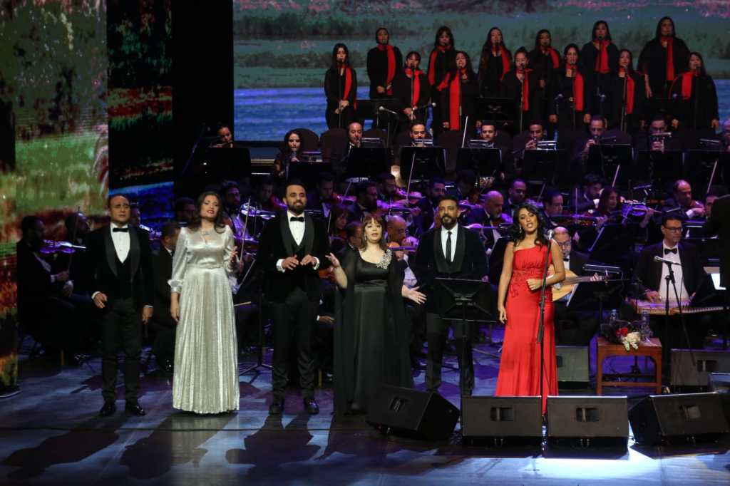 وخلالها إرتفعت رايات العزة والفخر فى المسرح الكبير ومع الموسيقى الوطنية المدموغة بروح النصر العظيم استلهمت عصا القيادة فى يد المايسترو الدكتور علاء عبد السلام الأمجاد والبطولات ووجهت المشاركين من فنانين وعازفين لتتدفق النغمات فى إنضباط وإنسجام وترتسم لوحة إبداعية تعكس عظمة أمة قهرت المستحيل جملتها أبياتاً من ابداعات الشاعر جمال بخيت وأصوات كوكبة من نجوم مصر هم محمد ثروت، محمد الحلو، هانى شاكر ومن مطربى الموسيقى العربية بالأوبرا وليد حيدر، رحاب عمر، محمد حسن، غادة آدم، حسام حسنى، حنان عصام لتُضاء القلوب بذكريات ملحمة العبور وتنبض الألحان بتاريخ محفور فى الذاكرة وتتعالى فى جنبات منصة العرض تراتيل الوفاء للوطن والتى عبرت عنها أعمال السلام الوطنى، خلى السلاح صاحى، أوبريت الأرض الطيبة، يا بوى يا مصر، أهيم شوقاً، مصر يا أول نور فى الدنيا، يا حبيبتى يا مصر، كل بلاد الدنيا جميلة، عاشت بلادنا، يا أغلى إسم، وانت ماشى فى مصر، مصر هى أمى، بالأحضان، دويتو بلدى، احلف بسماها وصاحبها مشاهد فيلمية ووثائقية حكت قصة العبور العظيم من لحظات التحدي إلى ساعة النصر وأخرجها مهدى السيد .